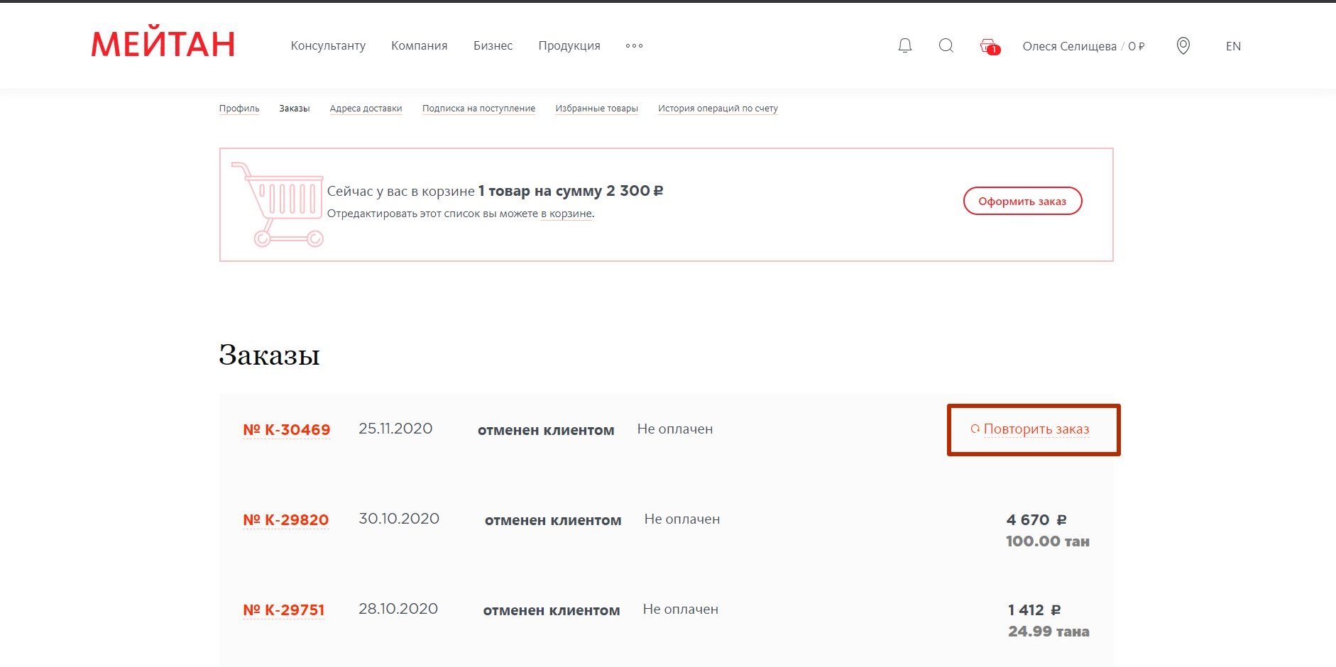 - повторить ранее созданный заказ.